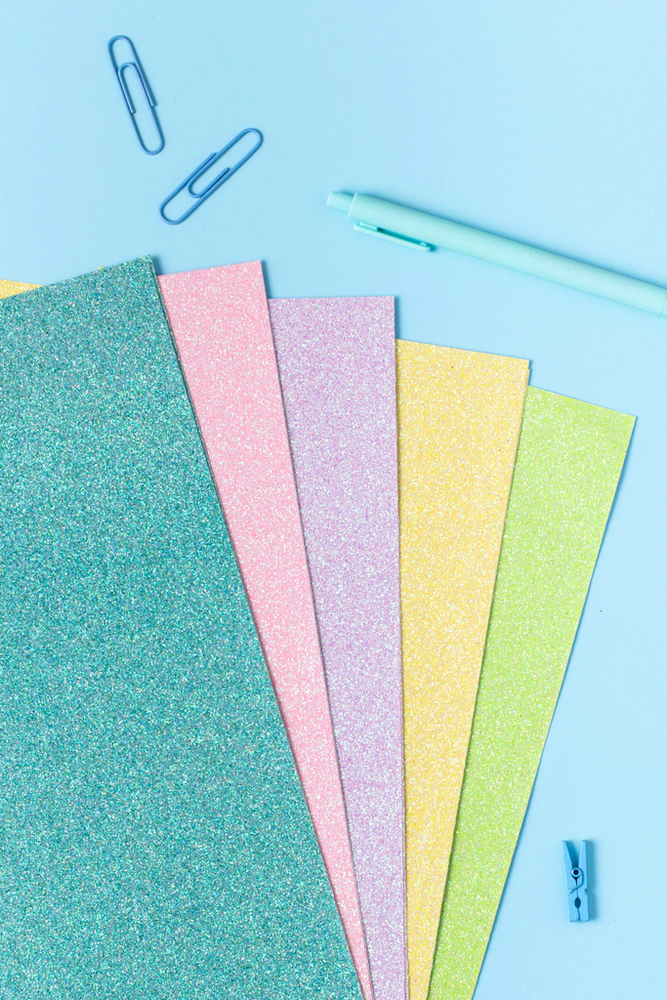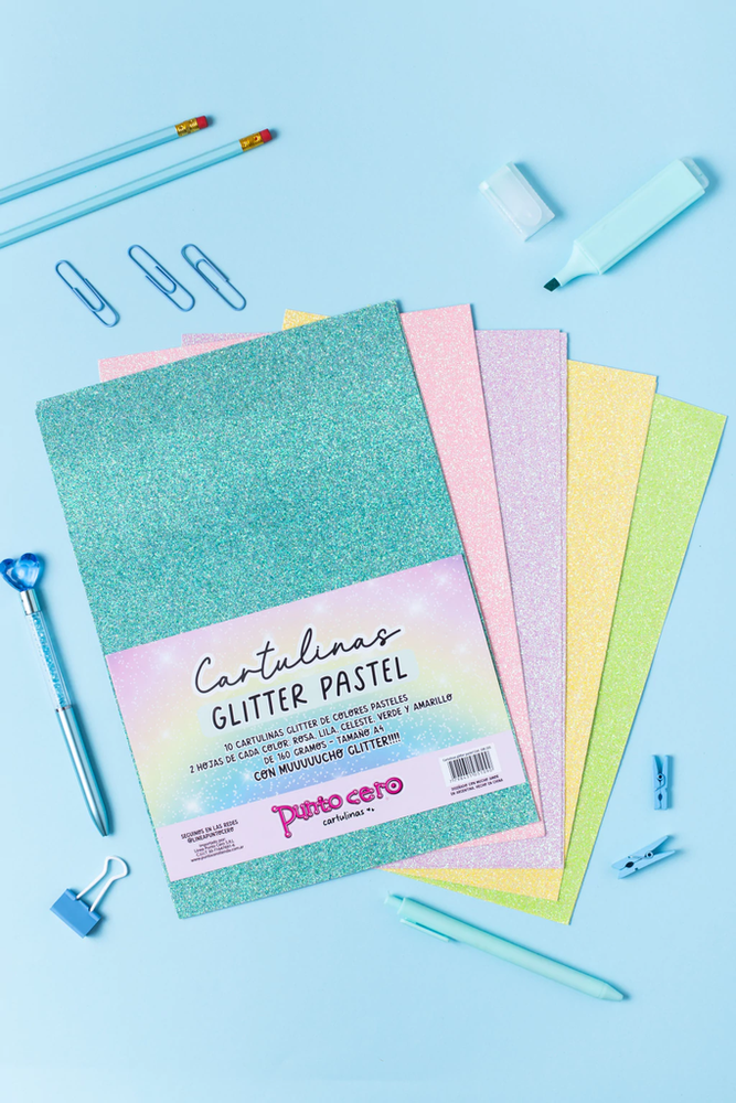 Cada unidad trae 10 cartulinas de 160 gramos tamaño A4 con glitter de colores pasteles! 5 colores: rosa, lila, celeste, verde y amarillo CON MUCHO GLITTER