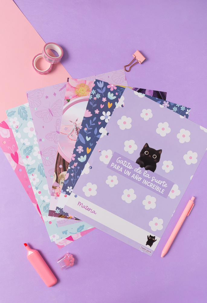 • Impresos en cartulina de 200g • Embolsados individualmente, con 6 separadores cada unidad. • Para carpeta A4, con 5 perforaciones