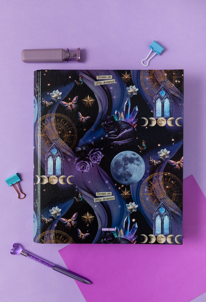 Carpeta tapa dura tamaño A4 con hendido circular y 2 anillos.