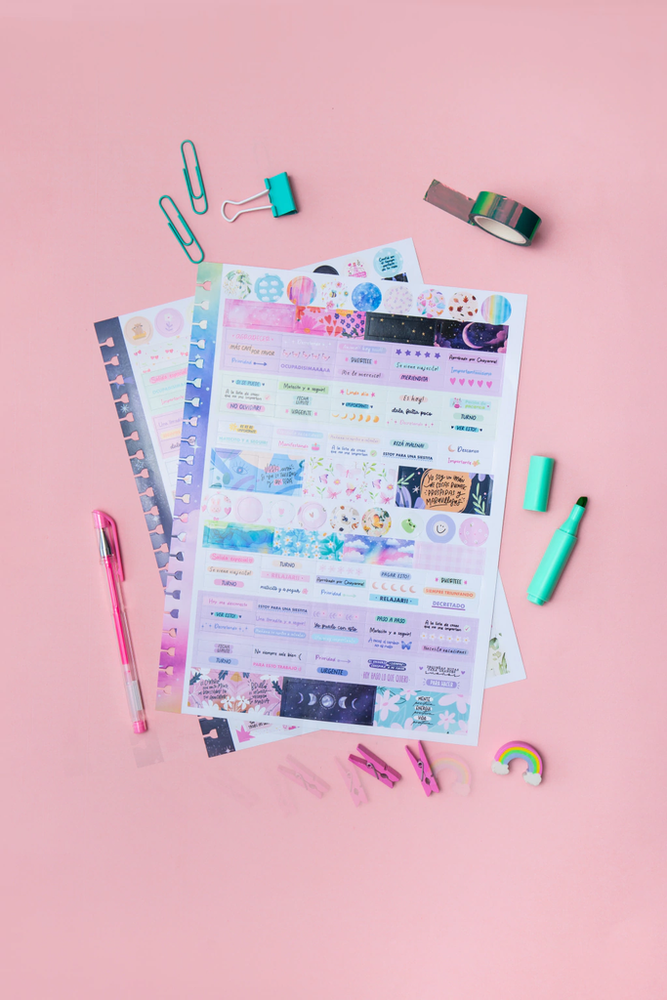 Pack de 2 planchas de stickers tamaño A4 (21x29,7 cm) de la colección Mi Punto Cero ¡Se pueden agregar, sacar y mover de los cuadernos!