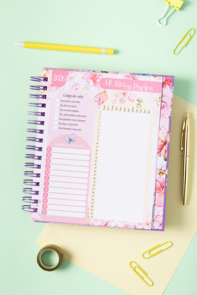 Además: Tiene elástico, Mi año en píxeles en cartulina, Visión del 2026, Planificación anual, Balance del año, Indice, Contraseñas, Notas, Hoja de recortables.