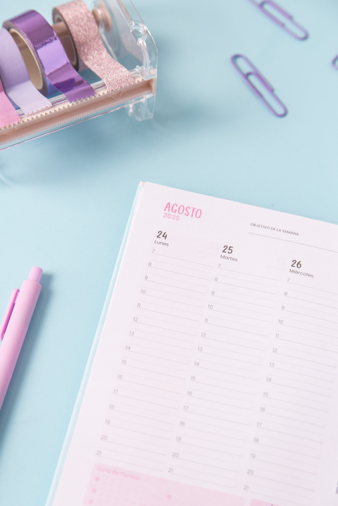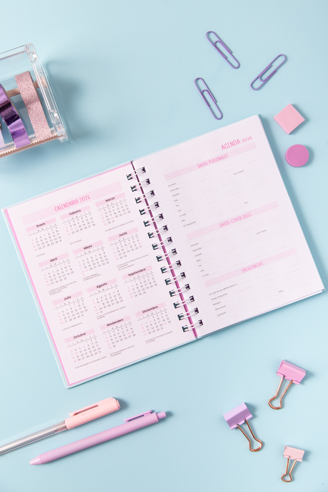 • Tapa dura • Con horarios de 8 a 20hs • Calendarios 2026, 2027 y 2028 • Planilla de gastos • Índice telefónico • Notas • Bolsillo • Hojas de 70 gramos