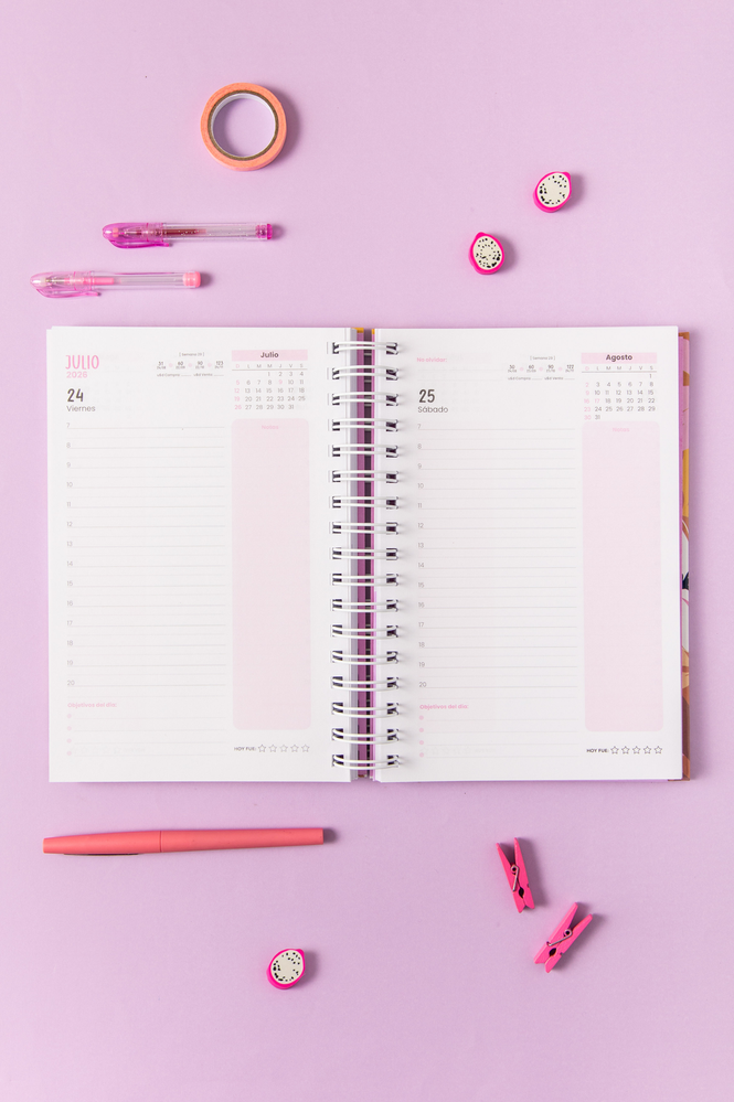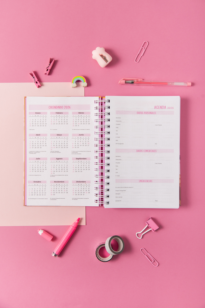 • Tapa dura • Con horarios de 8 a 20hs • Calendarios 2026, 2027 y 2028 • Planilla de gastos • Índice telefónico • Notas • Bolsillo • Hojas de 70 gramos