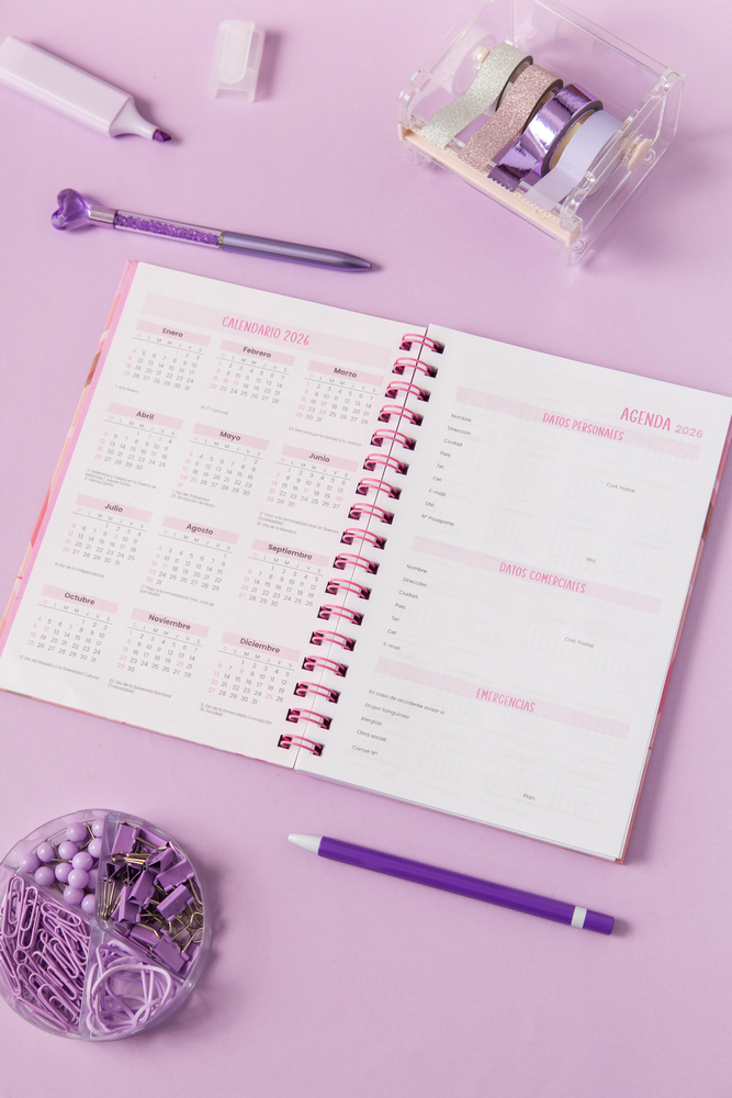 • Tapa dura • Con horarios de 8 a 20hs • Calendarios 2026, 2027 y 2028 • Planilla de gastos • Índice telefónico • Notas • Bolsillo • Hojas de 70 gramos