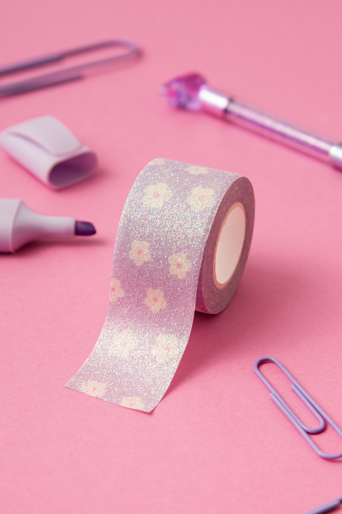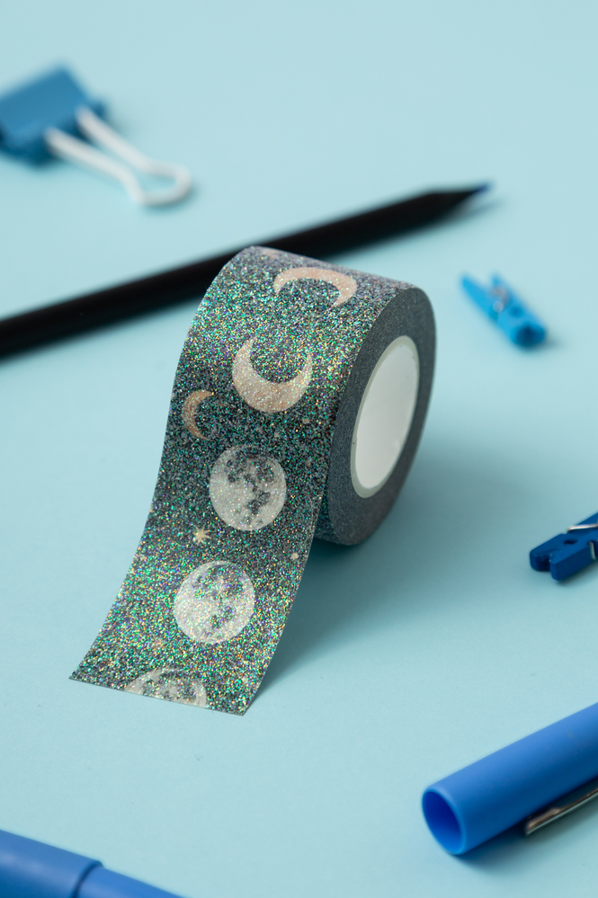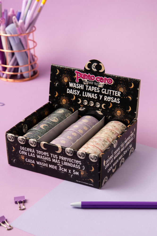 ¡Decora todo con brillos! Washi tapes con diseño y muchísimo glitter. cada una mide 3cm x 5 cm Disponibles en 3 diseños: Lunas, Daisy y Rosas.