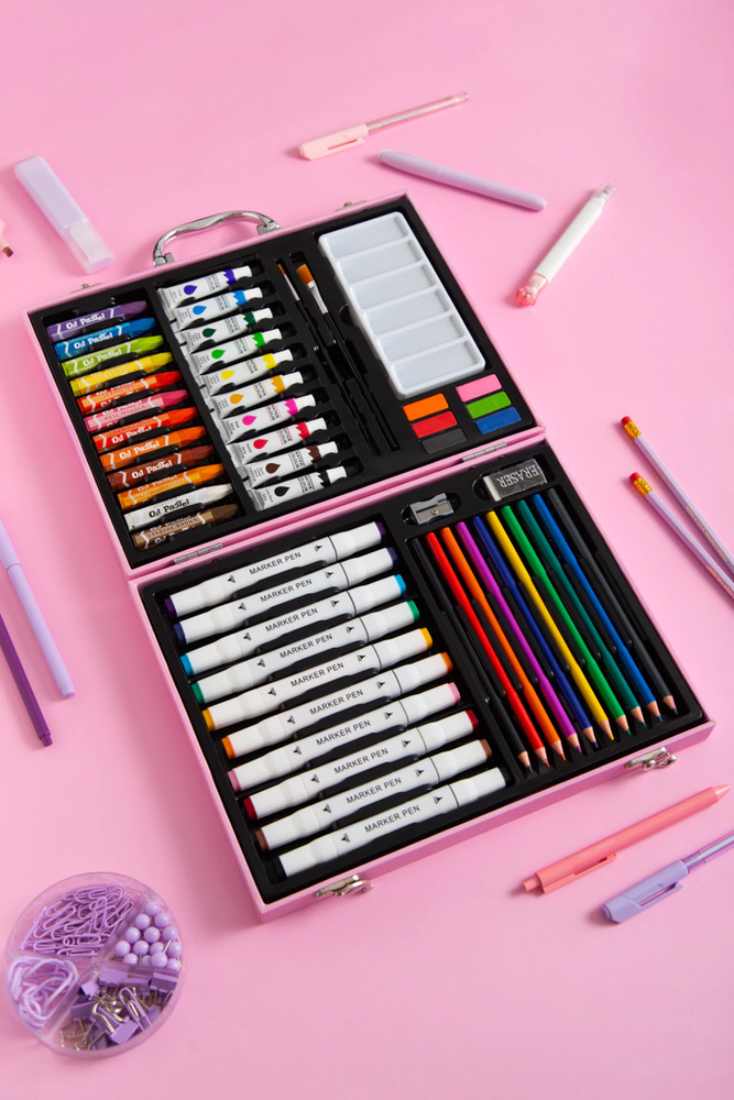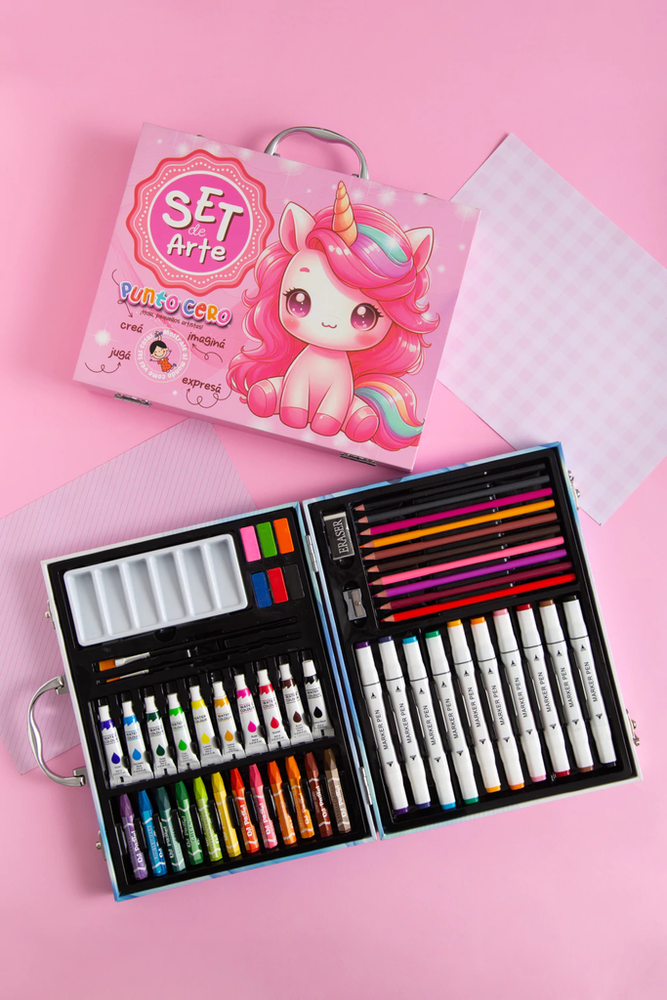 Una valijita llena de colores para despertar su creatividad y acompañarlos en cada proyecto. Viene súper completa, con una gran variedad de útiles para que los pequeños artistas den rienda suelta a su imaginación! Contiene: 10 pomos de tempera, 2 pinceles, paleta mezcladora, 6 acuarelas, 1 goma y 1 sacapuntas, 10 lápices de colores, 10 marcadores de doble punta (fina y gruesa) y 12 crayones.